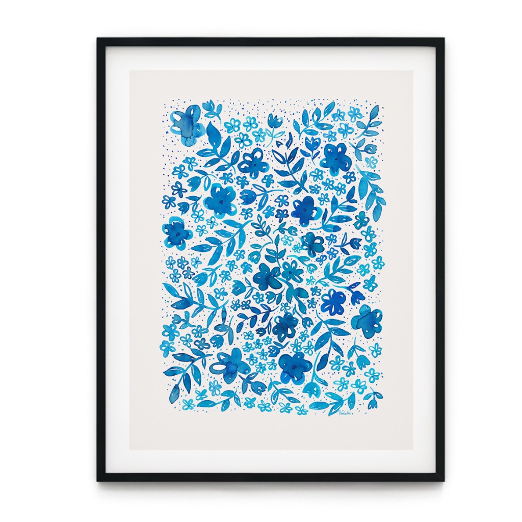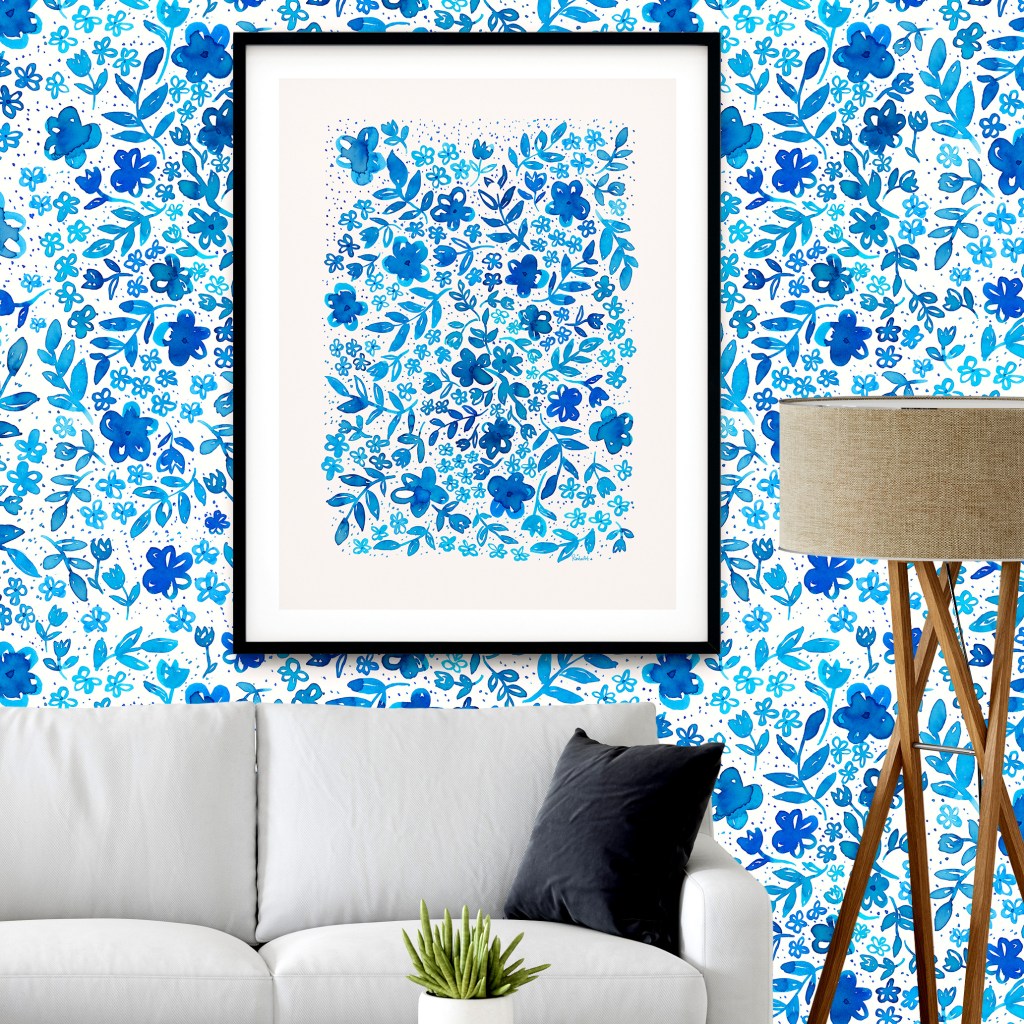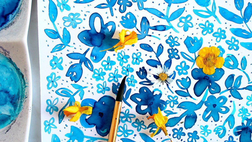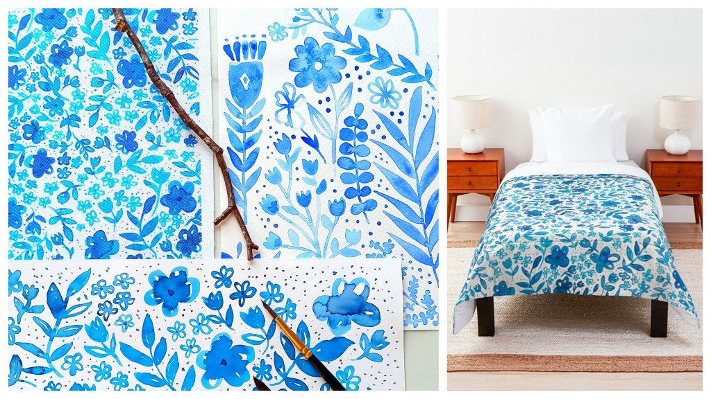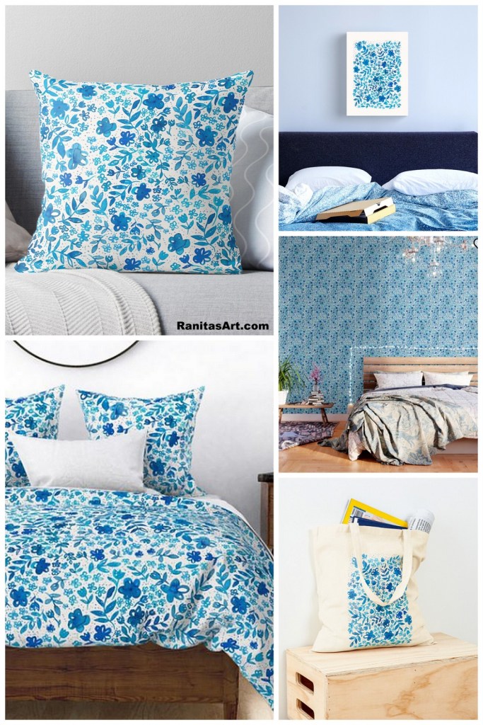 ES → Hoy les quiero mostrar este hermoso patrón floral en azul indigo que pinté con acuarelas. Trabajé sin boceto previo y utilizé solo un color. En el video les muestro mi proceso de trabajo. Luego con ayuda de Photoshop creé un patrón de repetición y una lámina donde se puede ver el dibujo completo en el centro. Les dejo algunas fotos y links para que puedan ver el patrón sobre diferentes superficies.