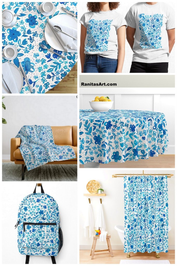 EN → Today I want to show you this beautiful floral pattern in indigo blue that I painted with watercolors. I worked without a previous sketch and used only one color. In the video I show you my work process. Then with the help of Photoshop I created a repeating pattern and a sheet where you can see the complete drawing in the center. I leave you some photos and links so you can see the pattern on different surfaces.