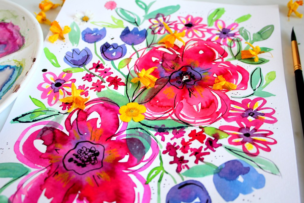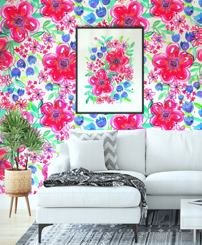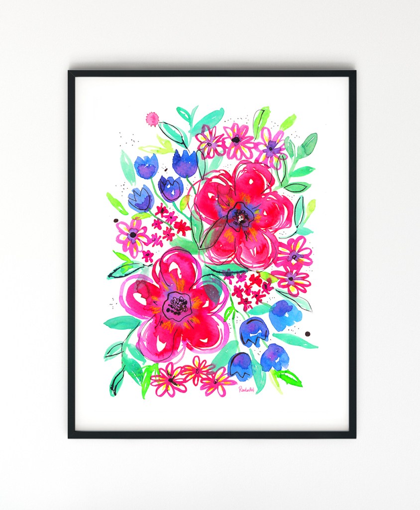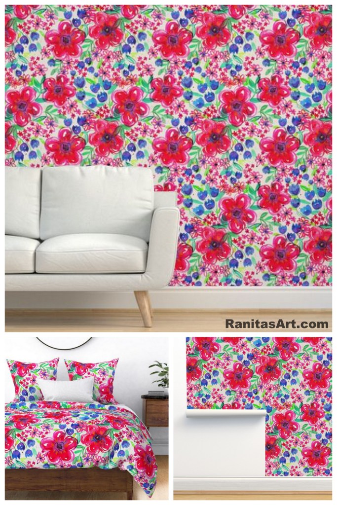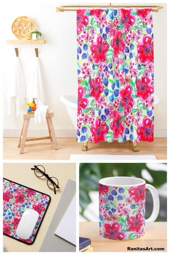 EN → In today’s post I want to show you a floral composition that I painted with watercolors and ink. I painted two large central flowers and smaller flowers on the sides trying to achieve a balance between the different sizes. I made a print and a repeat pattern with the help of photoshop. In the video you can see my work process. I leave you some photos with their links so you can see how the drawing looks on different products.