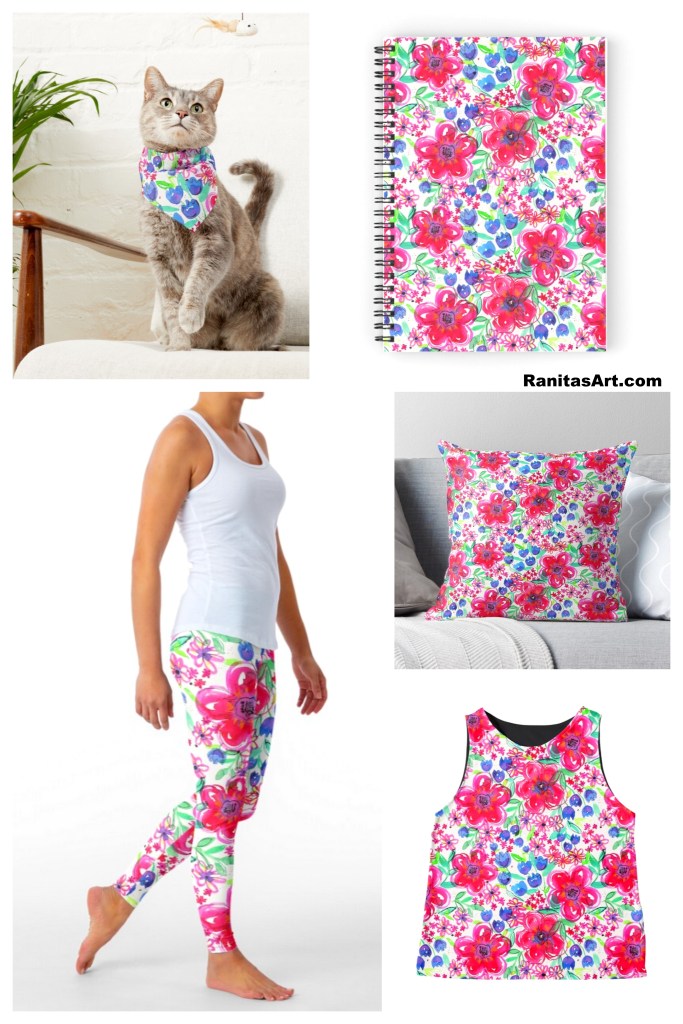 DE → Im heutigen Beitrag möchte ich euch eine Blumenkomposition zeigen, die ich mit Wasserfarben und Tusche gemalt habe. Ich habe zwei große Blumen in der Mitte und kleinere Blumen an den Seiten gemalt, um ein Gleichgewicht zwischen den verschiedenen Größen zu erreichen. Ich habe mit Hilfe von Photoshop ein Print und ein Wiederholungsmuster erstellt. Im Video könnt Ihr meinen Arbeitsprozess sehen. Ich hinterlasse euch einige Fotos mit Links, damit Ihr sehen könnt, wie die Illustration auf verschiedenen Produkten aussieht.