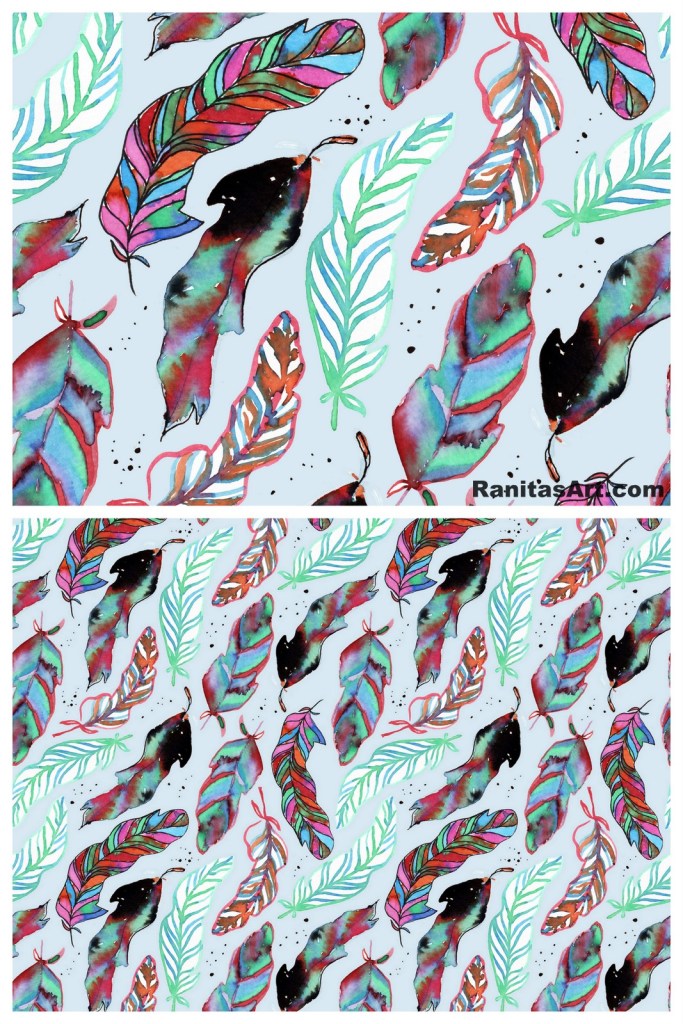 DE → Im heutigen Beitrag möchte ich euch ein Wiederholungsmuster zeigen, das ich mit einer Federzeichnung gemacht habe, die ich mit Wasserfarben und schwarzer Fineliner gemalt habe. Ich habe nicht alle Federn verwendet, die ich gemalt habe, sondern nur die mit Wasserfarben gemalten. Mein Arbeitsablauf zur Erstellung des Musters war → Federn malen, dann Zeichnung scannen, Federn mit Hilfe von Photoshop säubern und zuschneiden und das Muster erstellen.