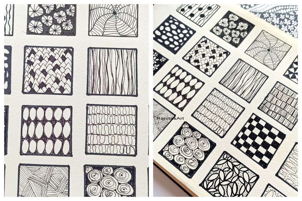 Bei der Zentangle-Kunst geht es darum, einfache bis komplexe Muster auf kleinen Flächen herzustellen. Man nennt es Zen, weil es eine entspannende Kunst ist, die sich auf die Konzentration fokussiert. Sie können Tausende von Beispielen im Internet finden, ich hinterlasse euch einen Ordner mit Beispielen auf Pinterest.