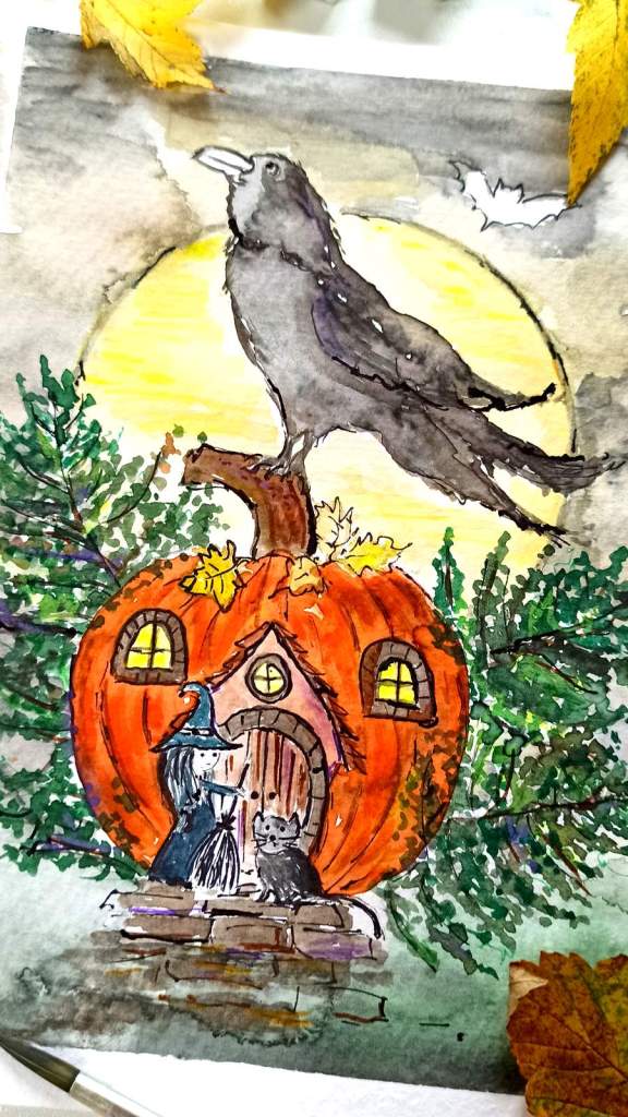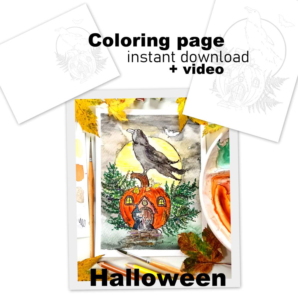 DE → Schritt für Schritt zeige ich euch, wie Ihr die gesamte Zeichnung mit Wasserfarben anmalt. Zuerst beginnen wir mit dem Malen des Mondes, des Kürbisses und des Himmels. Dann geht es weiter mit den Farnen, der Krähe und allen Details.