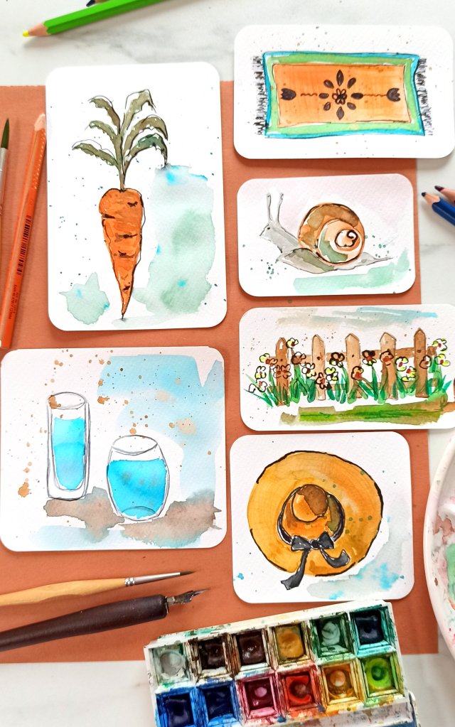 ES → estos son algunos de los dibujos que realizé para el reto diario del mes de junio 2024. Son dibujos muy simples con acuarelas y tinta.