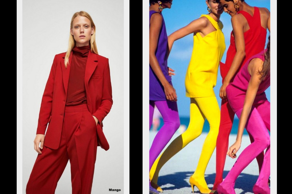 El monocromático : realmente no se desde cuando está a la moda, pero recién ahora llamó mi atención. Talvez porque vivo lejos de la ciudad y aquí llegan las modas más tarde. Definitivamente no lo usaría pero reconosco que si utilizamos un solo color y agregamos diferentes materiales el efecto es muy bonito. Encontré una fotografía en pinterest de Versace en la revista de Vogue de supuestamente el año 1991. Se puede ver perfectamente que las modas son cíclicas. La fotografía de la izquierda es de Mango.