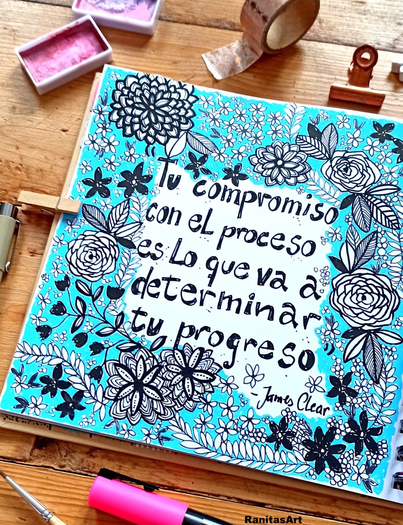 La segunda página que pinté es una frase de un libro que estoy leyendo » Habitos Atómicos» de James Clear. Es una frase geniál, para releer cada día. Te hace recordar el compromiso que debes tener con los proyectos que quieres llevar adelante y con tus habitos saludables.