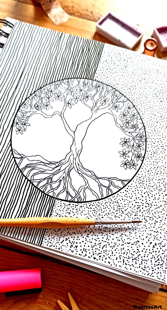 Al principio pensé en rellenarlo solo con árboles de la vida porque me encantan para dibujar y su significado, pero faltaba algo, no me inspiraba lo suficiente.