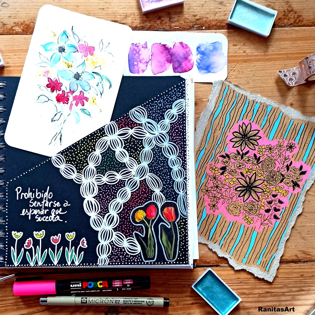 Las hojas negra del sketchbook tienen una especie de sobre para guardar papeles, yo le adjunté una ilustración con flores que pinté sobre un trozo de cartón de los envoltorios de amazon, una mezcla de colores de acuarelas y un ramo de flores pintado en acuarelas.
