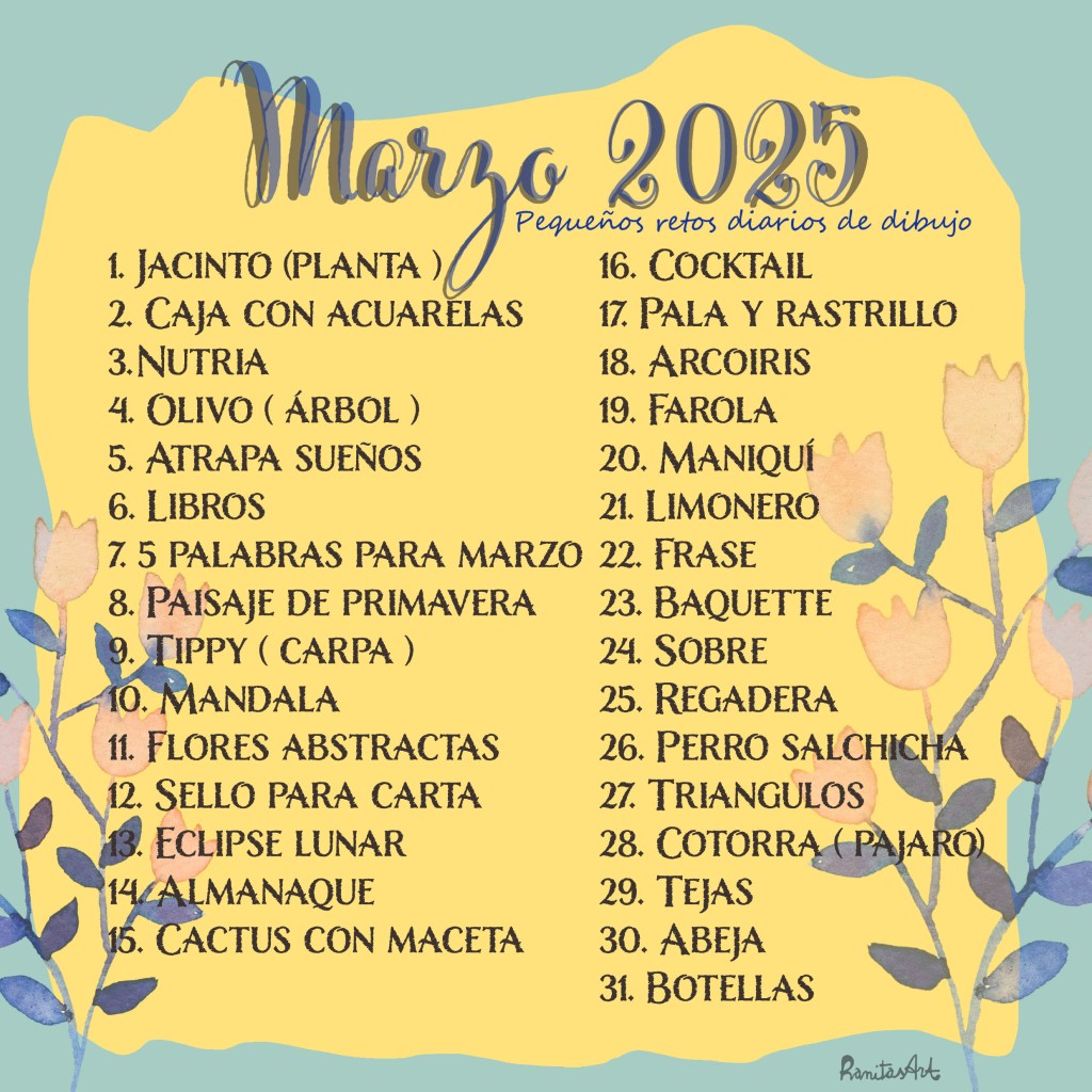 Hoy les comparto la lista de pequeños retos diarios de marzo. Una lista bien variada para debloquear la creatividad. Recuerden que pueden utilizar el medio que más les guste. Pueden compartir sus dibujos en instagram con el Hashtag #ranitasartretosdiarios o escribir un comentario en el blog.