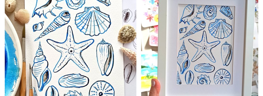 EN → in today’s post I show you a beautiful shell painting. In the video I explain step by step how to draw the different shells. It is an ideal work for the holidays. You can paint it in any color you want and it looks beautiful when you frame it and hang it up.