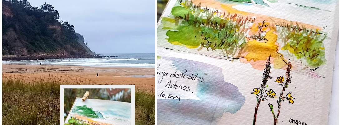 EN → In my case, I wanted to write down in my Sketchbook the day we visited Rodiles Beach in Asturias, Spain. It was a cloudy day, the weather was mild, but the clouds let the sun’s reflection through. There was no wind and it drizzled at times. The beach is located in the municipality of Villaviciosa and the Villaviciosa estuary flows into it. It is 1 km long and has tan-coloured sand. A beautiful natural setting without buildings, surrounded by cliffs and a beautiful Heucaliptus forest with a large picnic area. It is ideal for going with the family or surfing.